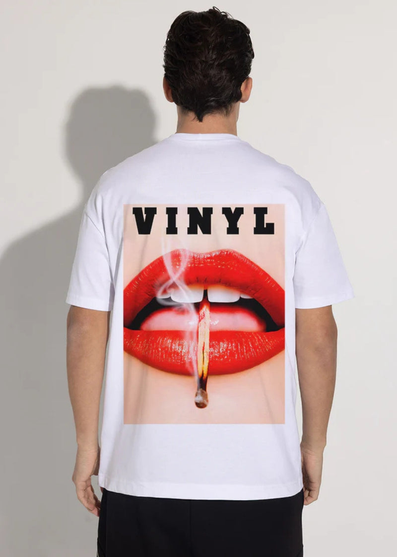 Ανακάλυψε το απόλυτο statement κομμάτι για το φετινό καλοκαίρι! Το ανδρικό oversized t-shirt VINYL σε λευκό χρώμα με εντυπωσιακό print στην πλάτη, συνδυάζει urban αισθητική και fashion-forward χαρακτήρα. Στο πίσω μέρος κυριαρχεί το χαρακτηριστικό τυπώμα “Lips & Matchstick”, ενώ στο στήθος ξεχωρίζει το διακριτικό τετράγωνο σήμα σιλικόνης VINYL.