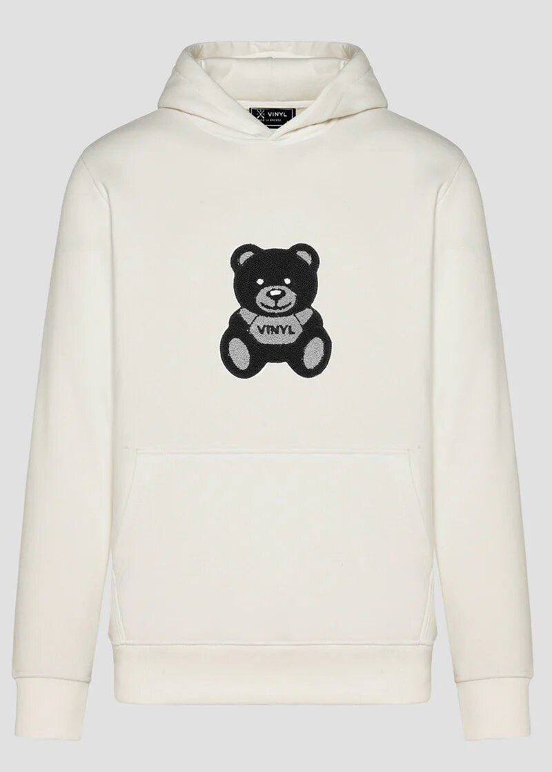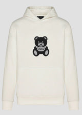 Φούτερ λευκό με κεντημένο fluffy patch αρκουδάκι. Ενιαία μπροστινή τσέπη και κουκούλα χωρίς κορδόνι. Τελείωμα με λάστιχο ριπ